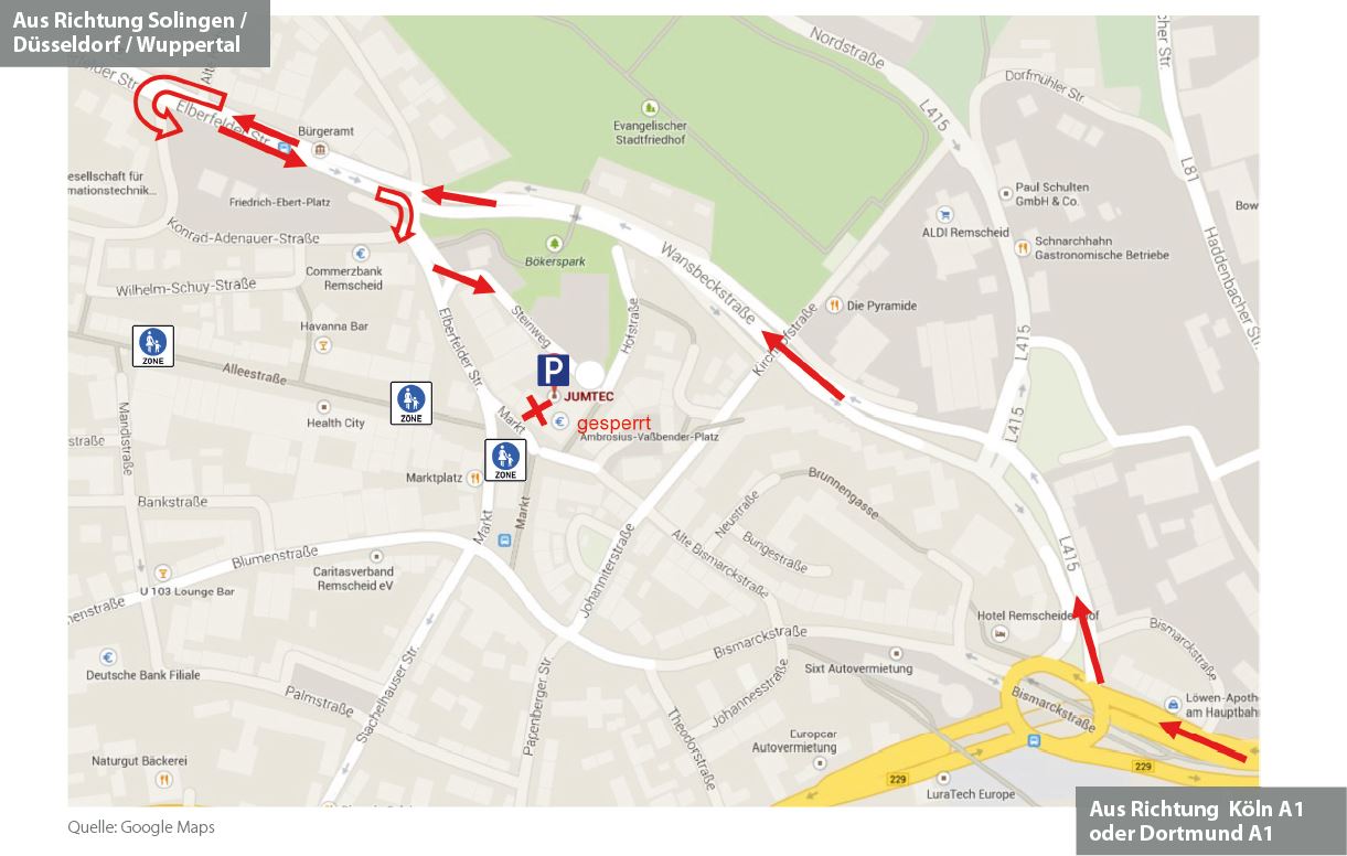 Aus Richtung A1 von Köln oder Dortmund Abfahrt Remscheidüber die L229 Neuenkamperstraße Richtung Innenstadt . Am Bahnhofskreisel die 1. Abfahrt Richtung Zentrum / Remscheid Hasten. Die Wansbeckstraße 2-spurig den Berg hoch und nach der Bergkuppe links halten und am Busbahnhof drehen. Siehe Detailplan Seite 1. Danach an der Ampel rechts abbiegen und sofort wieder links in den Steinweg. Am Ende befindet sich ein Wendebereich mit einem Baum in der Mitte. Auf der rechten Seite befindet sich unser Firmenhof.