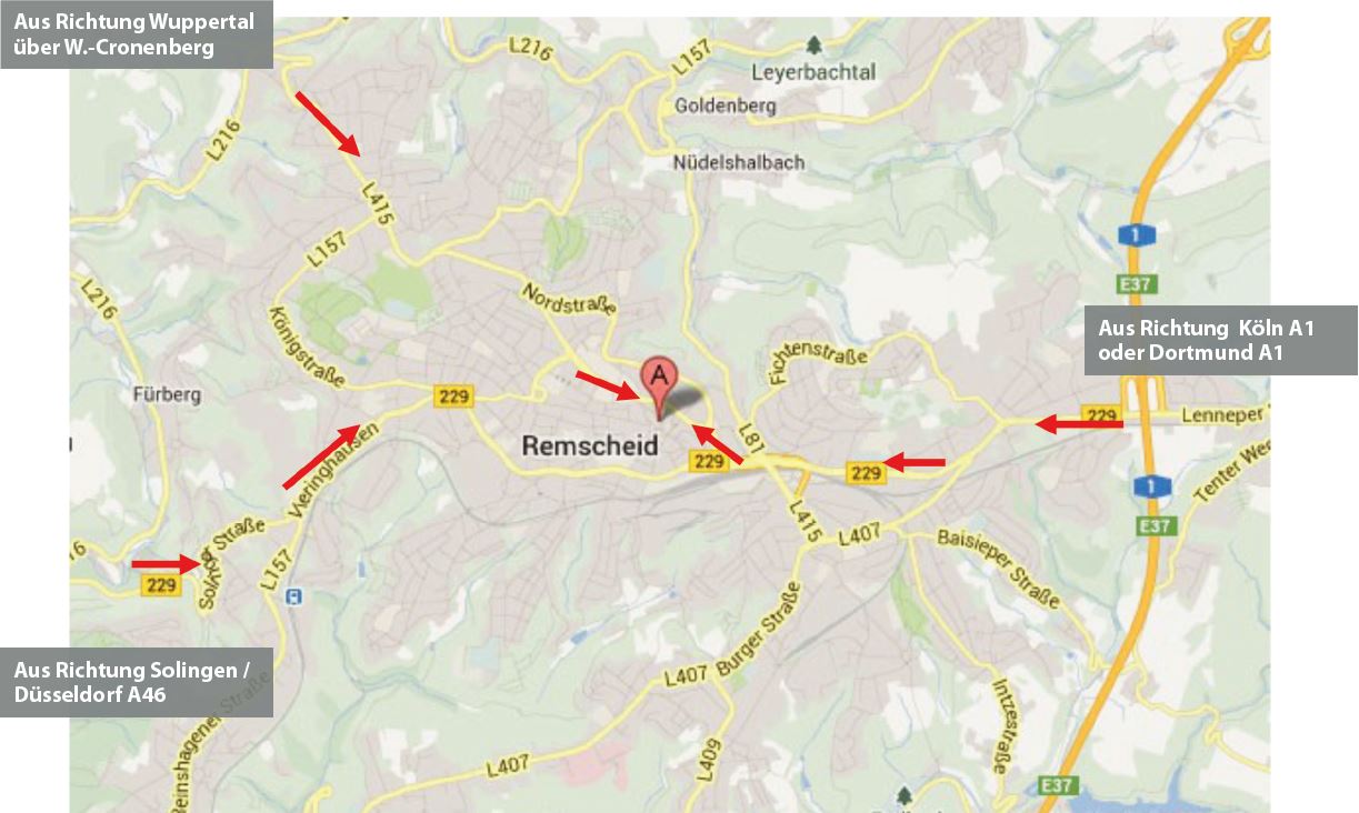 Von der A46 über die Kohlfurt L216 und der Solinger-Straße L229 Richtung Innenstadt. Kreuzung Amtsgericht geradeaus zum Zentrum. Um das Rathaus und Alleecenter in Richtung Bahnhof / RS Lennep. Am Busbahnhof an der Ampel rechts abbiegen und sofort wieder links in den Steinweg. Am Ende befindet sich ein Wendebereich mit einem Baum in der Mitte. Auf der rechten Seite befindet sich unser Firmenhof.